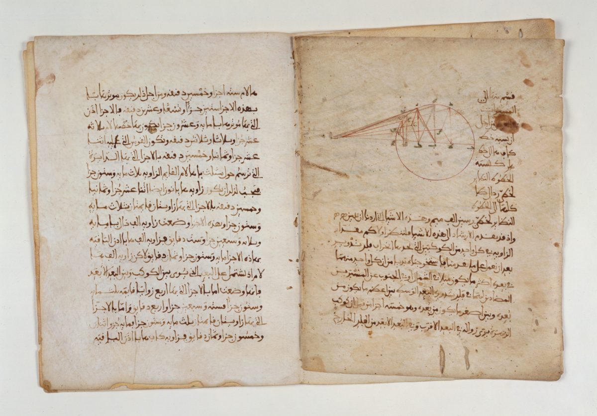 Other Notes: These eight vellum folios consist of two fragments from an Arabic translation of the most influential astronomical treatise prior to the time of Copernicus, the Almagest, which was written in Greek in the 2nd century AD by the Alexandrian astronomer Ptolemy. It was from its Arabic title, al-Majistz, that Ptolemy’s work received the name by which it is generally known today. Four Arabic versions of the treatise were prepared in the 9th century, though only two are extant: that by al-Hajjaj, completed in AH 212 (AD 827-8), and that by Ishaq ibn Hunayn and later revised by Thabit ibn Qurrah in AH 288 (AD gor). The fragments in the Khalili Collection are from the second version, for they correspond, with minor variant readings, to passages in a manuscript preserved now in the British Library, one of only two recorded copies of the second half of that Arabic version.