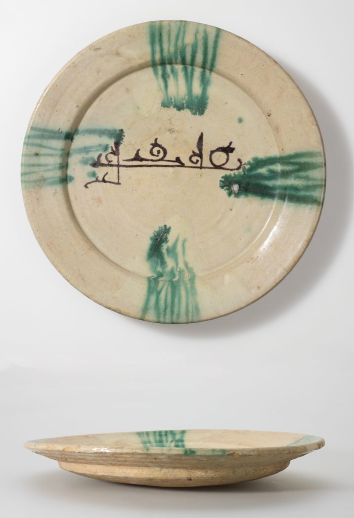 When using opaque glazes, there is no easy way to prevent decoration in other colours from running. This could be exploited to decorative effect: here, the fuzzy contours of the inscription, which appears to read ‘abduhu (‘His [God’s] servant’), give the impression that it has been written with a brush rather than a pen, while the green patches at the rim drip down in a deliberately haphazard manner, which also imitates the drip-and-splash decoration of Tang stonewares.