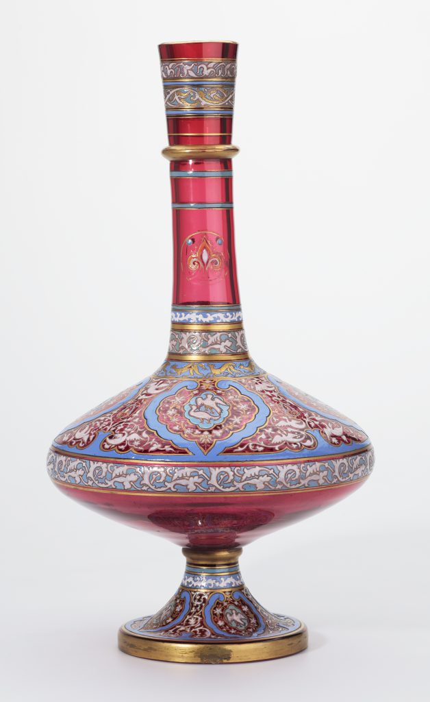 Materials: heavy ruby glass, blown and tooled, with enamelled decoration and gilding