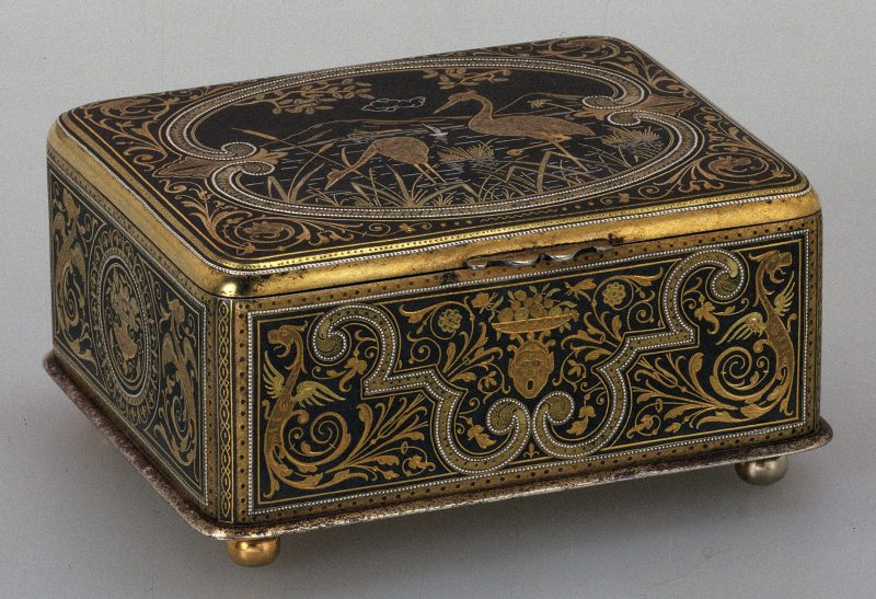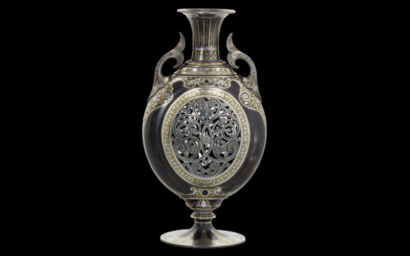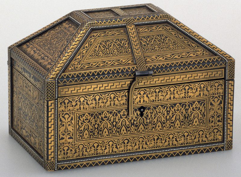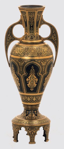 The Khalili Collection of Spanish damascene metal is unrivalled in its quality and depth. With over 100 pieces, 22 of which are signed by Plãcido Zuloaga himself and include such well documented pieces as the magnificent casket and pair of alhambra-shaped vases from Fonthill House, made by Plãcido Zuloaga for Alfred Morrison.