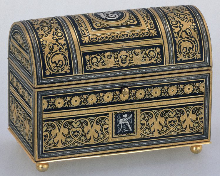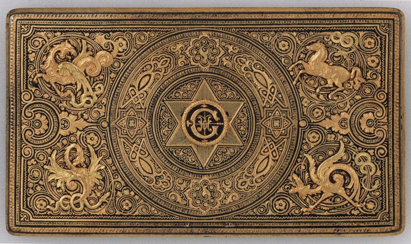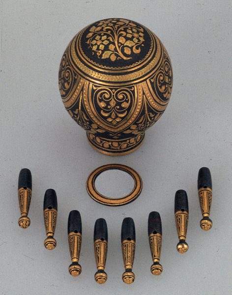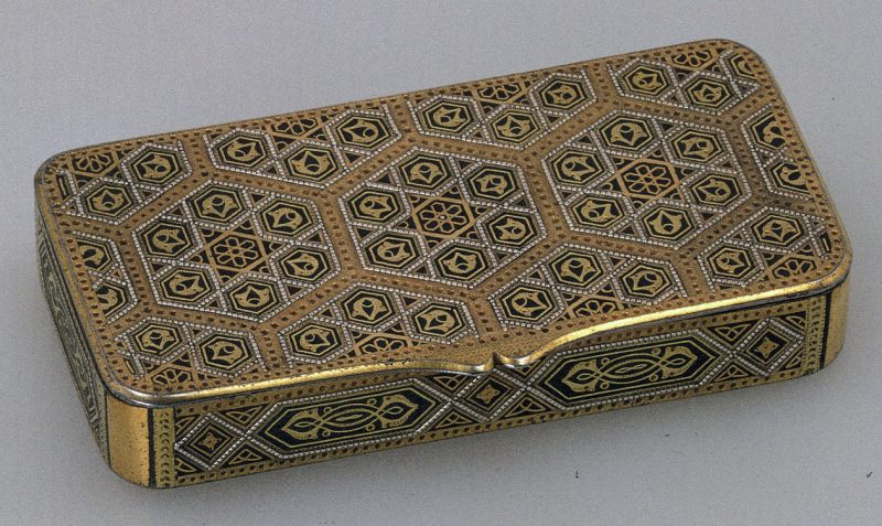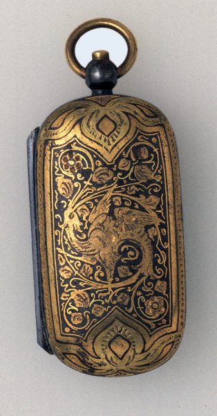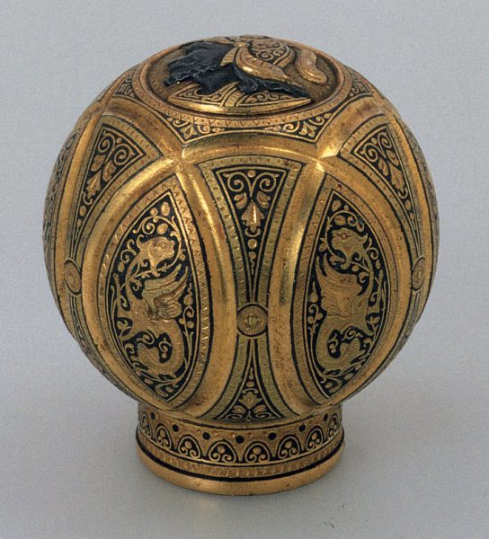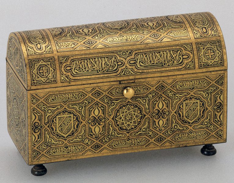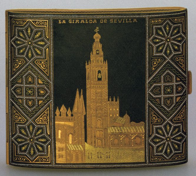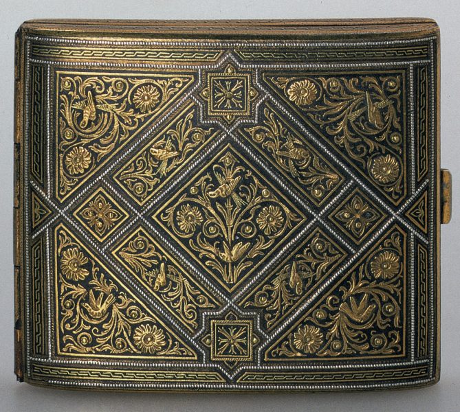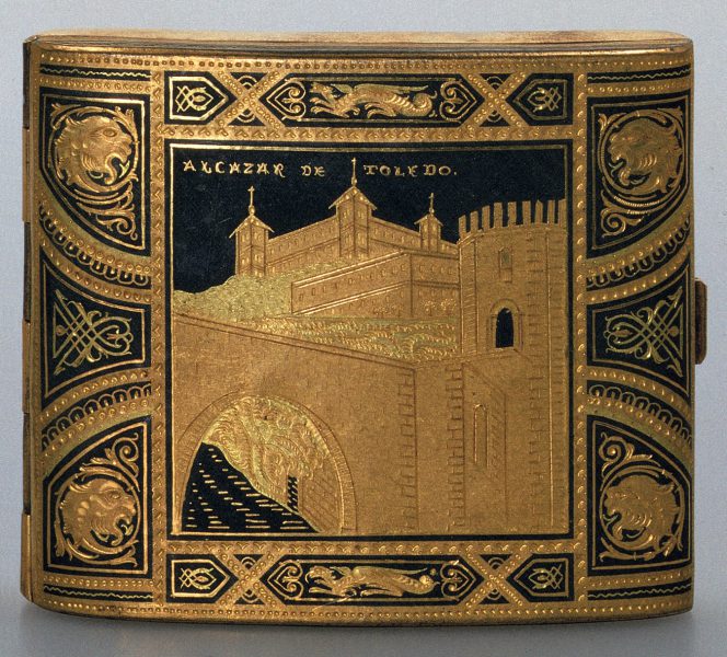 It was inevitable that the generation of great patrons should come to an end, and in order to ensure the continued survival of the art itself, its practitioners were obliged to seek a different outlet, a new type of consumer. While the quality did not diminish, the objects themselves were transformed by circumstances. Gone for ever were the single monumental projects requiring a team of artisans of various specialities and several years to complete. Smaller pieces directed towards a broader clientele became the goal of this small but exclusive industry, though never to the detriment of quality. The Khalili Collection is rich in these objets d’art , jewellery, and elegant everyday items that illustrate the manner in which the damascener’s art became accessible to a different public, and thereby acquired renown worldwide. Unfortunately, today the Fabergés, Falizes, and Zuloagas are gone, together with the awe and appreciation of past generations for manual artistry coupled with genius. Not only is this Collection unique in the number of Spanish damascened objects that it contains, but it provides an excellent perspective of Spanish damascening in the art and industry so evident in the pieces.
