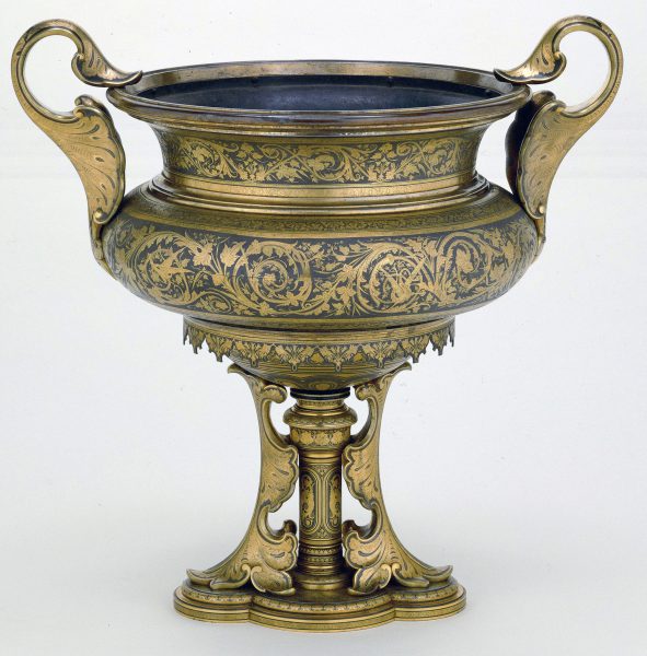 The town of Eibar, remote in the mountains of the Basque country became, through their efforts, the centre of European damascening in the 19th century. Interestingly, the impact of the Zuloagas was, for a brief period, even greater in England than in Spain itself. The Collection has been fortunate to be able to acquire the most important pieces commissioned of Plãcido Zuloaga, the supreme damascener of that family, by the great 19th century English collector Alfred Morrison. The Morrison pieces establish a benchmark by which we may evaluate all that follows. The Khalili Collection contains many fine examples of Spanish damascene, but none quite so fine as those made by Don Plãcido and the disciples he trained in his workshop in Eibar during the latter half of the 19th century.
