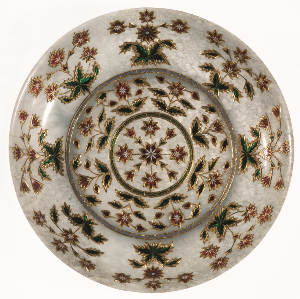 Among the most gifted Mughal craftsmen were lapidaries who from the 17th century excelled in the art of making precious objects, notably in jade. Thanks to the kundān technique, they were able to inlay hardstones with precious stones as well as with enamels, as seen in this dish. The motifs derive from 17th century Mughal models, but their stiffness and lack of naturalism indicate a more recent period of manufacture.