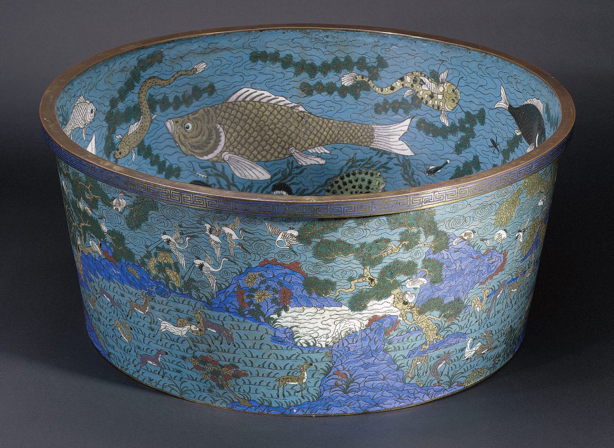 This large vessel would have been used to contain ornamental fish and plants such as lotus, in a garden. Inside it is decorated with carp, frogs, and other water creatures among weeds, while the exterior shows an idyllic landscape with auspicious cranes and deer that symbolize immortality.