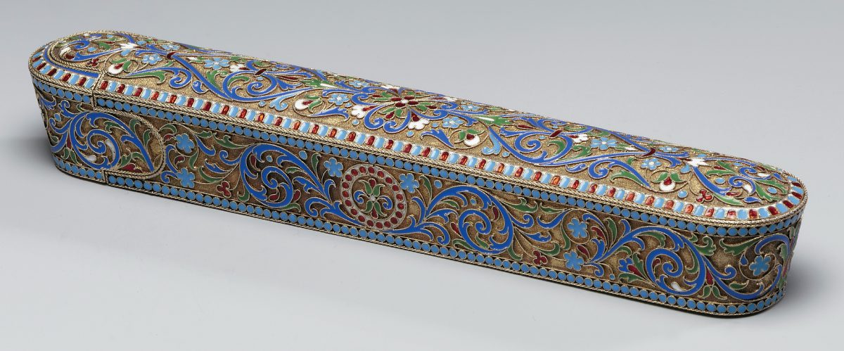 Replication of the pen box form in other materials, such as silver, was more unusual. In this instance the traditional shape has been followed, while the curvaceous foliate scrolls of filigree enamel decoration are more typical of contemporary Russian work.