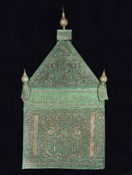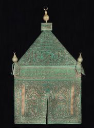 Materials: mahmal cover and finial banners of green silk, embroidered in silver and silver-gilt wire over cotton thread padding; finials of gilded copper alloy are a of a later date
