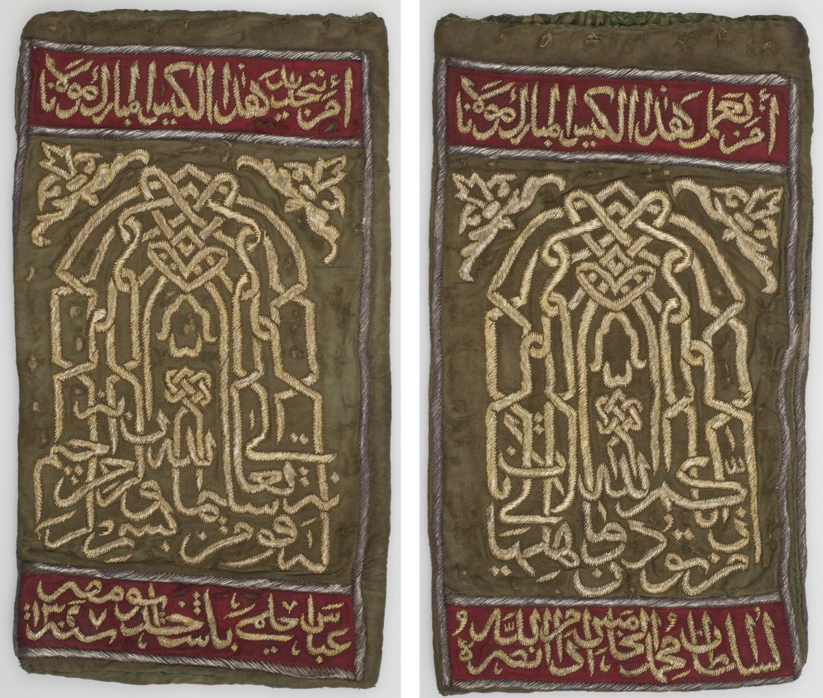 Materials: olive-green silk with red silk appliqués, embroidered in silver and silver gilt wire over padding of cotton threads; lined with a contemporary piece of cloth of the type used as a curtain or cover in the Prophet’s tomb in Medina