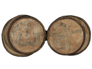 This miniature prayer book contains the verses of Ayat al-Kursi (‘Verse of the Throne’; folio 1a); views of the Holy Sanctuaries at Mecca and Medina (folios 1b–2a); the names ‘Allah’ and ‘Muhammad’ (folios 2b–3a); the ‘Ninety-Nine Names of God’ (al-asma’ al-husna) and a litany of the names of the Prophet, in a reticulated pattern (folios 3b–4a); the surah al-Fatihah and the hilyah of the Prophet (folios 4b–5a). All are in embossed and découpage work.