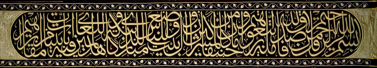 This is one of eight panels that form the hizam (‘belt’), an inscribed band that encircles the upper part of the Ka‘bah. This panel, which would have been on the south side, is embroidered with verses 95-97 from surah Al ‘Imran (III). The text refers to ‘the religion of Abraham’, ‘the first house of worship that was in Mecca’ and ‘the Station of Abraham’.