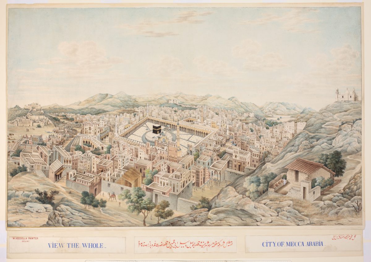 The view of Mecca is remarkable for its comprehensiveness and accuracy and, in the manner of contemporary topographers, brilliantly combines a plan of the city with a bird’s-eye view from about 60 degrees. Muhammad ‘Abdallah, whose grandfather, Mazar ‘Ali Khan was court painter to the Mughal ruler Bahadur Shah II, was commissioned by the Sharif of Mecca to depict the sacred monuments of his realm in the second quarter of the 19th century. It is the earliest known accurate eyewitness record of the city.