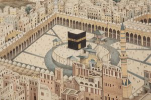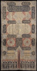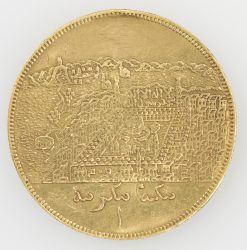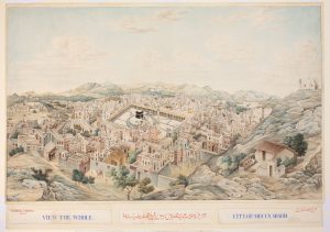 The view of Mecca is remarkable for its comprehensiveness and accuracy and, in the manner of contemporary topographers, brilliantly combines a plan of the city with a bird’s-eye view from about 60 degrees. Muhammad ‘Abdallah, whose grandfather, Mazar ‘Ali Khan was court painter to the Mughal ruler Bahadur Shah II, was commissioned by the Sharif of Mecca to depict the sacred monuments of his realm in the second quarter of the 19th century. It is the earliest known accurate eyewitness record of the city.