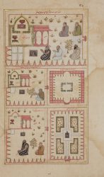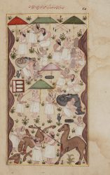 - Man attacked by a lion (folio 21b); Man saved from the jaws of a lion (folio 23a); A feast (folio 23b). The three small-scale paintings are illustrations to a parable about a very poor woman taking pity on some beggars passing by and feeding them; her act of generosity was rewarded when a stranger saved her son from being eaten by a lion. The feast is probably in celebration of the son’s safe return to his mother.