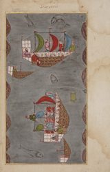 - The pilgrims’ ships crossing the Sea of Oman (folio 3b). The two larger ships carry pilgrims; one, on the right, appears to be casting (or raising) anchor. The smaller vessels may be fishing boats.