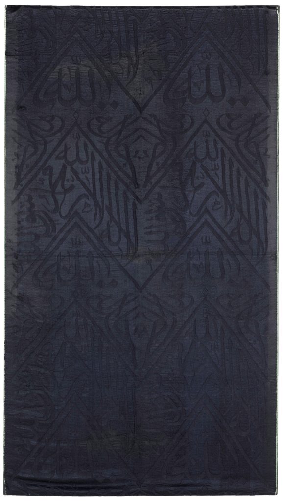 The pattern consists of zigzag bands alternately enclosing the shahadah (‘There is no god but God, Muhammad is the Messenger of God’) and the invocation ‘O! God’, ‘May his Majesty be exhalted’, the latter in mirrored script.