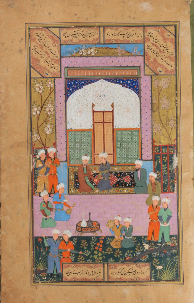 an enthroned ruler, with courtiers and attendants, in a garden