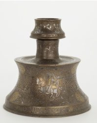 This shape is typical of Syrian containers for ointments (unguentaria) or for balsam (balsamaria), which could be single or double, as in this example, and were widely exported from the Roman period onwards. They contained scented pastes (scents in Islam and the ancient world were solid, not liquid) or aromatic substances dissolved in oil, such as chrism or balsam, which were esteemed for their therapeutic properties and exported particularly from Mecca. The balsam came north with the incense trade, brought by camel caravans from Arabia Petraea to the ports of the Syrian coast, so the use of a camel support for the twin flasks is picturesquely appropriate.
