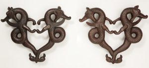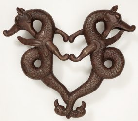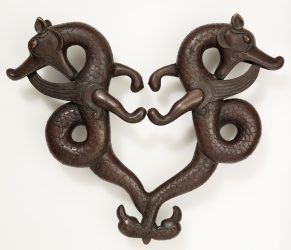 The door handles are in the form of winged dragons back-to-back, their scaly bodies knotted and terminating in gryphons’ heads. They have no hind legs. Such figures are often described as door-knockers but the two loops securing them to a door would have made them immovable. Yet even movable handles on mosque doors in 12th- to 14th-century Syria and Egypt are often up to three metres from the ground and so must have been for show only. The present handles derive from a design of the early 13th-century engineer al-Jazari, who cast the knockers of the Artuqid palace at Diyarbekir (Topkapi Saray Library A 3472, folios 169a–b), although in his drawing the dragons are shown confronted and without knotted tails. The dragons’ knotted tails may be an allusion to a pseudo-planet, Jawzahr, which was invoked by Muslim astronomers to explain eclipses of the moon. They may also derive from the entwined serpents of Aesculapius in the eastern Hellenistic world. In Iraq and the Jazira, they also decorated the arched gates of cities or fortresses, like the Talisman Gate at Baghdad (618 AH/ 1221 AD, no longer extant), the Aleppo Gate at Diyarbekir (589 AH/ 1183–4 AD), and the gate of the Citadel of Aleppo (606 AH/ 1209–10 AD).