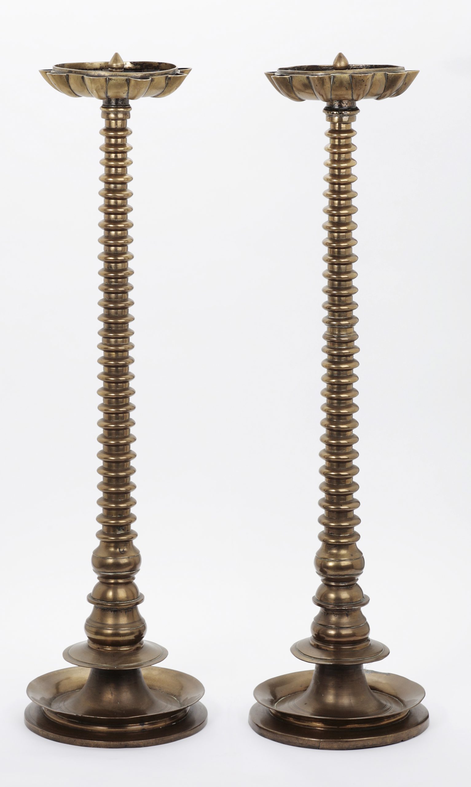 The lamp stands have a bell-shaped base and a shaft with horizontal ribs, surmounted by a nine-spouted lamp with a stylized lotus bud at the centre. They have important features in common with a bronze oil lamp attributed to a workshop in Bengal, presented by the Mughal emperor Akbar to the shrine of Shaykh Mu‘in al-Din Chishti at Ajmer in Rajasthan.