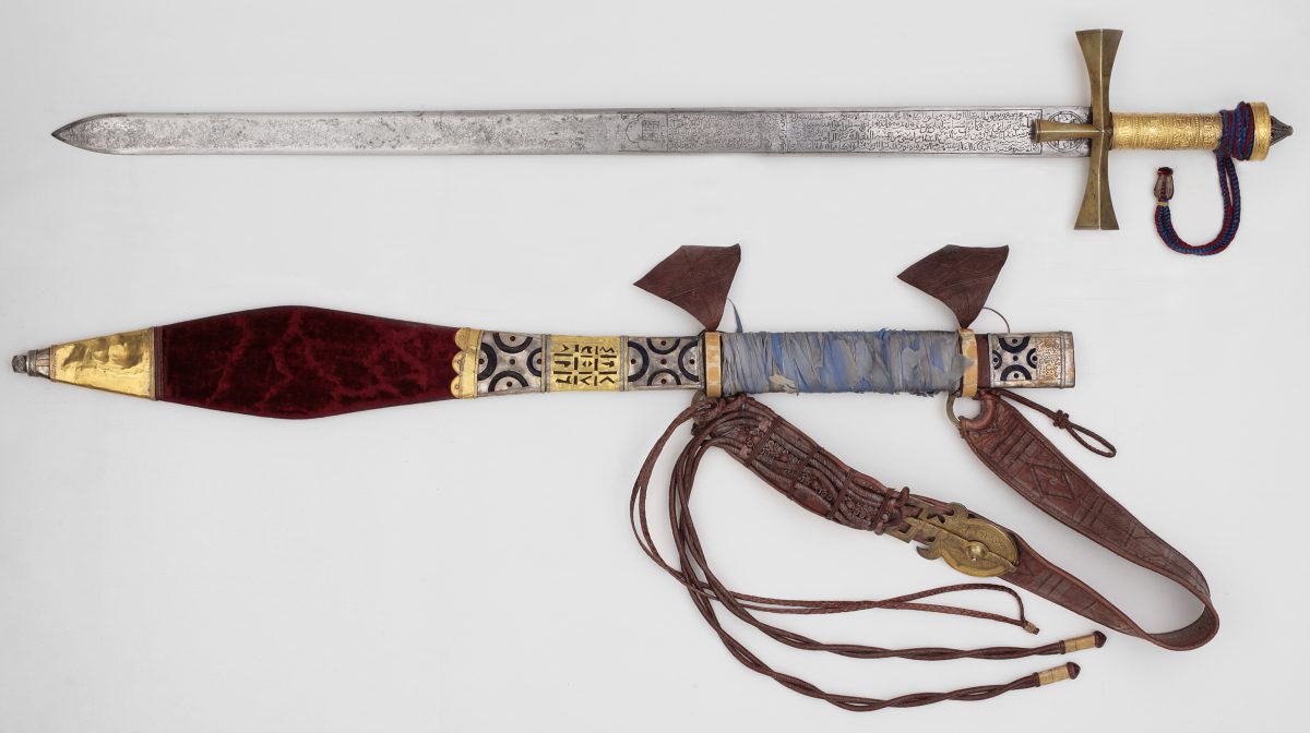 The design of the hilt and quillons derives from the European knightly sword of the Middle Ages, with its large cruciform cross-guard. The straight two-edged blade is engraved with Arabic inscriptions, including a dedication to ‘Ali Dinar, and roundels, squares and panels with talismanic inscriptions, some of them in cabbalistic script.