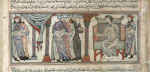 This was the Jami‘ al-Tawarikh (‘Compendium of Chronicles’), which was to be in four parts: (1) the history of the Mongols from Jenghiz Khan to the death of Ghazan; (2) a history of Öljeytü, followed by a long universal history from Adam, the biblical patriarchs and the ancient kings of Persia to the Prophet Muhammad and the caliphs; (3) the ‘Five Dynasties’ of the Arabs, the Jews, the Mongols, the Franks and the Chinese; and (4) a geographical compendium. The history of Öljeytü and the geographical compendium are lost, and the principal illustrated section appears to have been the world history, now in two different fascicles (one in Edinburgh University Library, the other the Khalili manuscript), which were haphazardly rebound in the 18th century. Together they comprise about half a manuscript of 400 folios or so, recording the history of the non-Mongol peoples of Eurasia. The very possibility of its compilation reflects the cosmopolitan culture of early14th-century Tabriz, where texts in Latin, Arabic, Persian, Syriac, Mongolian, Chinese and Sanskrit were available and everything from Chinese handscrolls to Old Testaments and Gospels from northern Europe could be used as appropriate illustrative material.