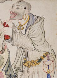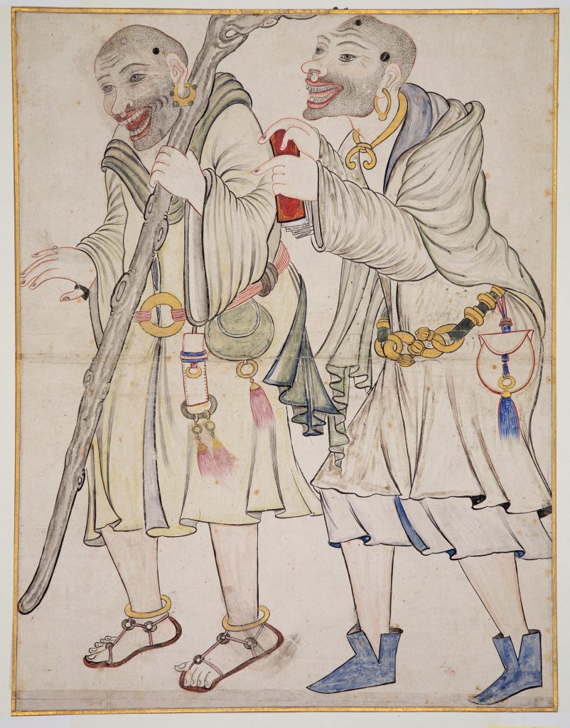 This large-format study is a version of a Chinese genre painting of the Yuan period showing Buddhist holy men (lohans). Its most striking feature is probably the gold jewellery worn by the two figures, including earrings, a torque, belts, anklets and even an archer’s thumb-ring. The jewellery contrasts strikingly with their homely apparel and footwear, which, like their shaven heads and branded ritual markings, suggest spiritual poverty and identify them as wandering dervishes (qalandars).