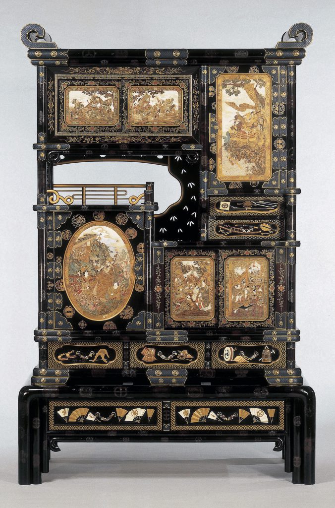 A porcelain-mounted lacquer cabinet with an asymmetrical arrangement of sliding doors, small drawers, and cupboards enclosing further small drawers, cupboards and shelves. The porcelain panels enamelled and gilt in the style of Kyoto earthenware, with mythological scenes including Nitta no Yoshisada throwing his tachi into foaming waves, a Chinese sage with attendants on a balcony, samurai warriors in combat, and courtiers with attendants. The interior panels of the hinged doors with birds and foliage, the drawers inlaid in ivory and pearl-shell, and lacquered in relief with military emblems, the frame lacquered with numerous mon, the sides with dragon and ho-o roundels, applied throughout with shakudo mounts and gilt aoi mon.