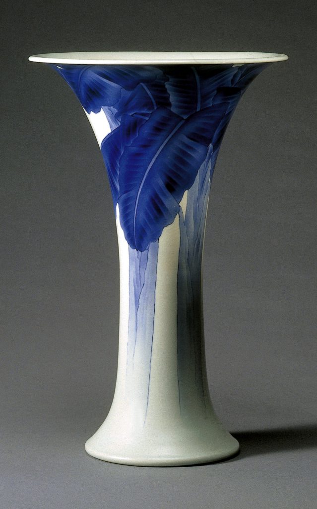 A porcelain trumpet-vase, the body of exaggerated flared form decorated with two banana-trees with large overlapping leaves in underglaze blue. This striking vase is markedly similar to one exhibited by Kozan in the Paris Exposition of 1900.