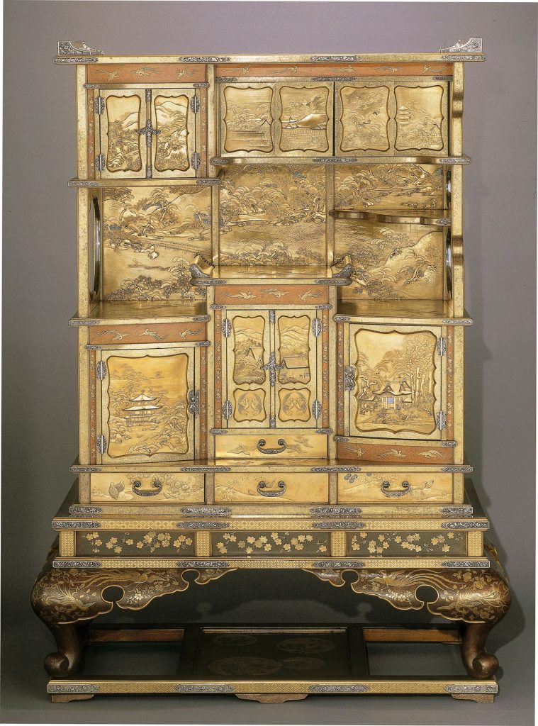 The sumptuous decoration of this cabinet shows how traditional lacquer styles were thriving at the very end of the Meiji Era. An accompanying letter claims that the cabinet was made in Japan for the Japan-British Exhibition as a representative piece of Japanese craftsmanship but was not finished in time for shipment to England.