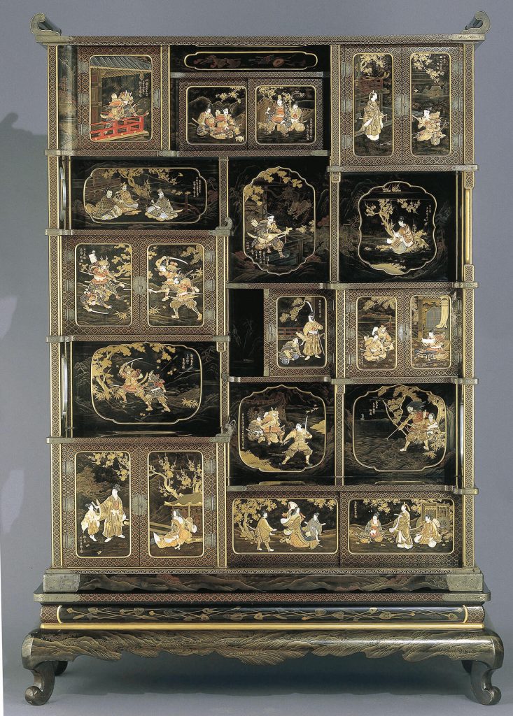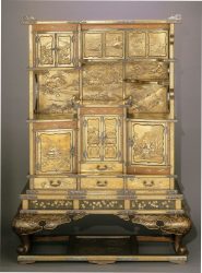 Materials: Wood, lacquered in togidashi-e, takamaki-e, hiramaki-e and nashiji, with inlay of ivory, bone, and shell; silvered and gilded fittings