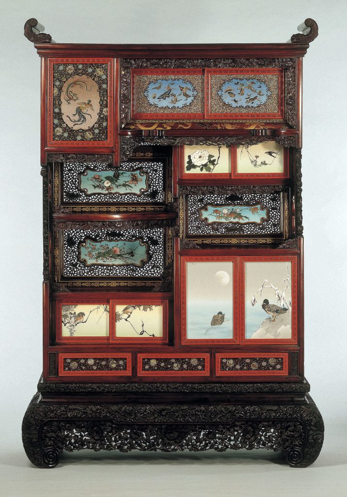 A hardwood and cloisonné enamel display cabinet, with an asymmetric arrangement of hinged doors, open galleries, and sliding doors. The upper part of the upper section with a single hinged door in cloisonné enamel worked in silver wire with a dragon confronting a phoenix in a graduated mottled stone-coloured cartouche, reserved against a dark plum-coloured ground decorated with stylized butterflies, phoenix roundels, and scrolling foliage; to one side, two sliding doors decorated with numerous butterflies on a pale blue ground within a similar stone-coloured border, in the same style.