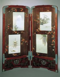 A pair of cloisonné enamel-inset, wooden two-fold screens each containing four rectangular panels, the group representing the four seasons. Each panel worked in musen and yusen and mounted in a teak simulated-basketwork panel and a coromandel-wood simulated-bamboo border applied with trailing vine. On one screen the panels depict a partially cloud-obscured sun above stems of autumn grasses, a snow-covered pagoda above snow-laden trees, a log raft on a river beneath pine – and cherry-trees in mist, and fish swimming beneath blue and white wisteria. On the other the panels decorated with butterflies above wild flowers, a winter view of snow-capped Mount Fuji, a turbulent stream flowing between rocks and autumnal maple-trees, and duck on a rock above others swimming on water. The teak panels decorated with trailing vine worked in flambé transparent enamelled copper, pearl-shell, lacquer, and lacquered pearl-shell vine-leaves. The reverse of each panel a single piece of mulberry-wood applied with ivory egrets in flight, perched on a gnarled stump or on a willow-branch. The leaves and branches worked in gold and coloured takamakie and hiramakie, and inset with aogai. With two lower mahogany panels pierced and carved with stylized sparrows and bamboo. The teak frame applied with cloisonné enamel mounts in the Chinese style.