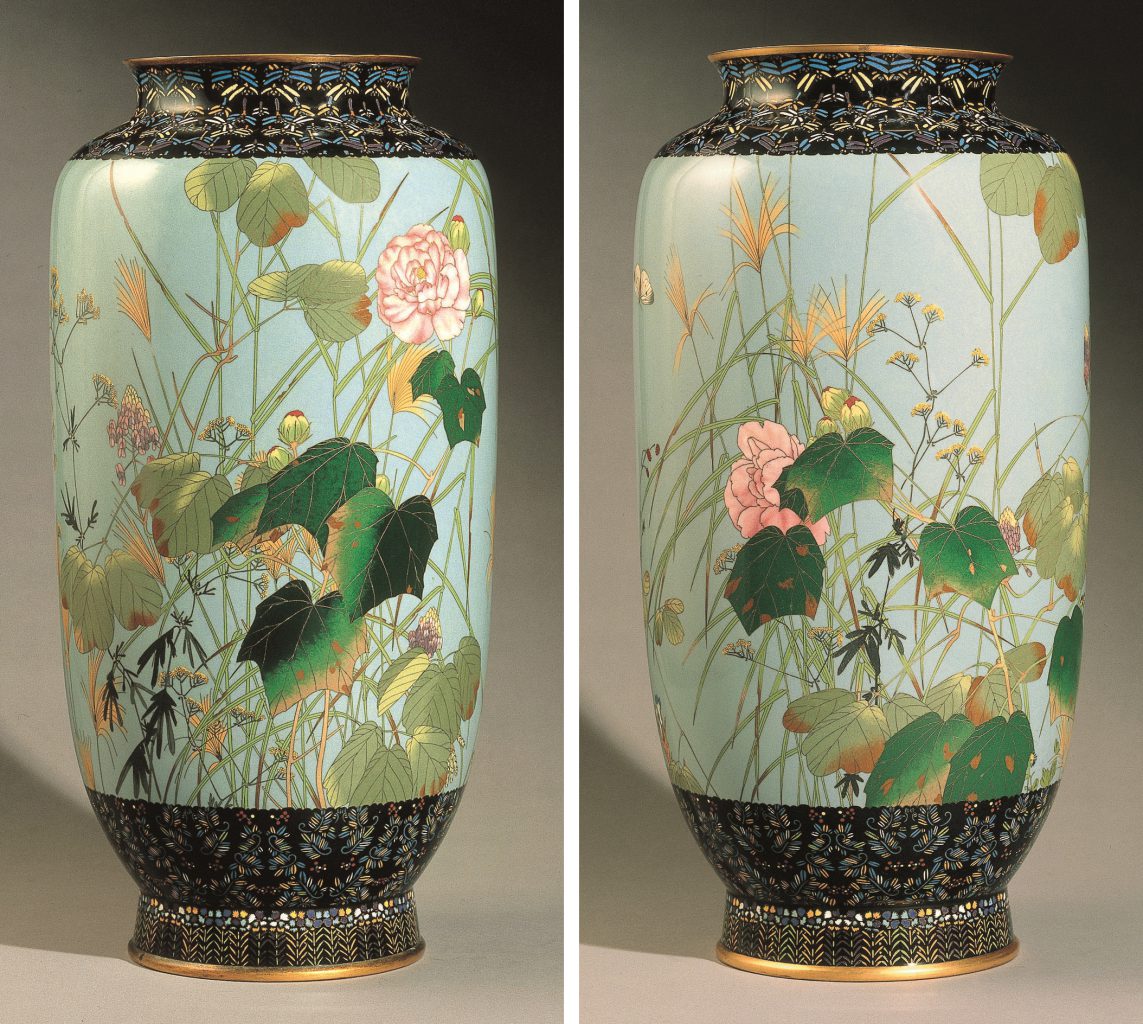 A pair of Cloisonné enamel vases with a design in the style of Nishi Chinnen (1792-1851), each decorated with butterflies above flowers and grasses on a pale grey ground. The flowers include peonies, Chinese bell-flowers, and susuki, and the butterflies are varaities of whites. The peony-leaves and some of the flowers worked in gilt metal wire, the others in silver wire, each with extensive shading; some of the smaller flowers of partially wire-less outline (shosen jippo). The upper border worked in silver wire with numerous stylized dragonflies of various sizes, on a black ground. The foot decorated with a border of stylized pinks beneath scattered foliage and berries, also on a black ground. Applied with gilt metal mounts.
