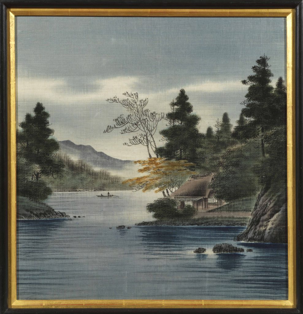 Title: A Yuzen cut-velvet panel depicting a thatched cottage on the bank of a lake