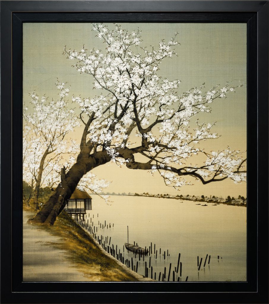 Title: Yuzen cut-velvet, blossoming trees on riverbank probably at Arashimaya