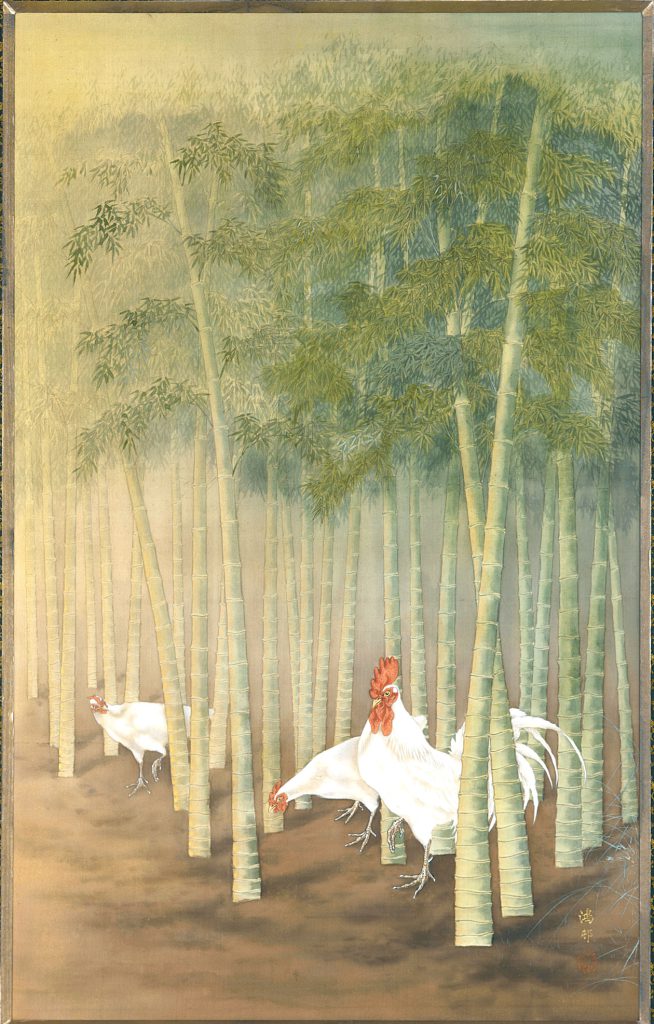 Materials: Ink and colours painting on silk of a cockerel and hens in a bamboo grove.