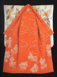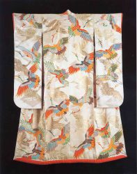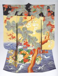 Materials: silk, figured satin weave (rinzu); freehand paste-resist dyed (yūzen) and hand-painted with applied gold