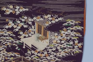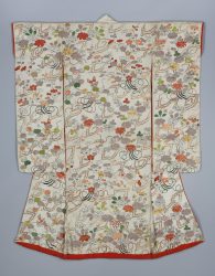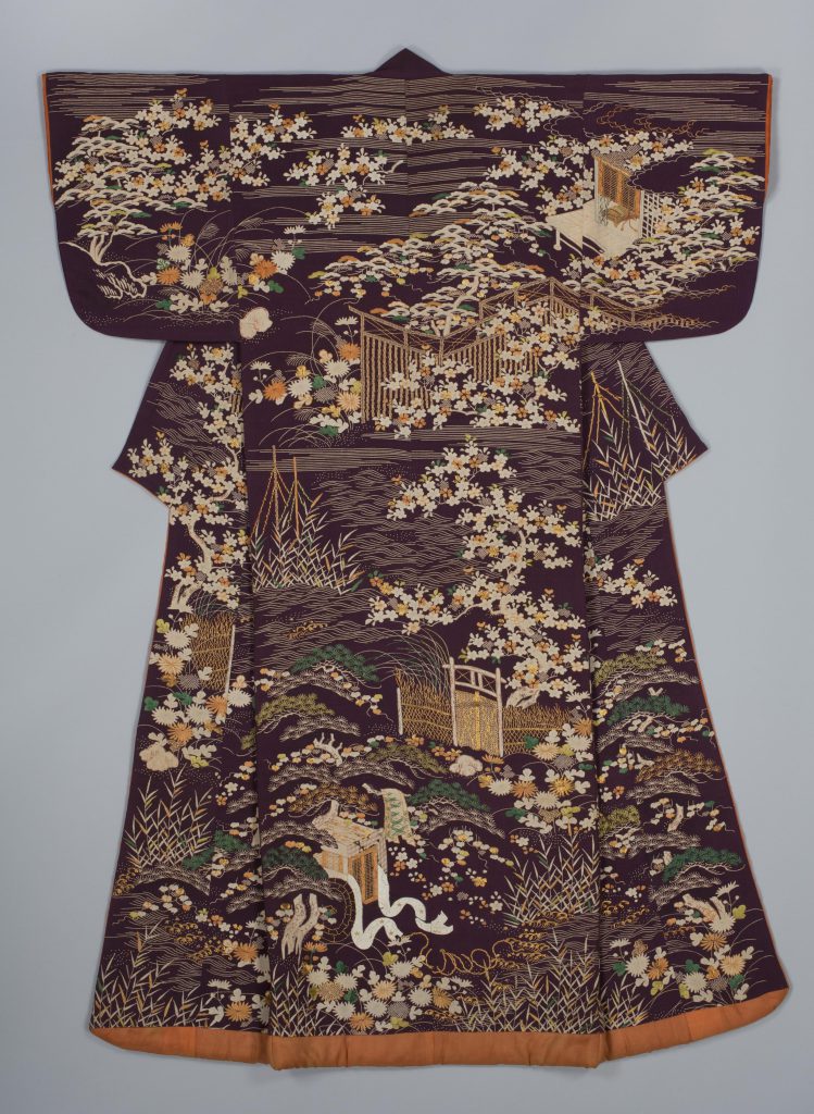 Materials: silk crepe (chirimen); freehand paste-resist dyed (yūzen) and embroidered in silk and metallic threads