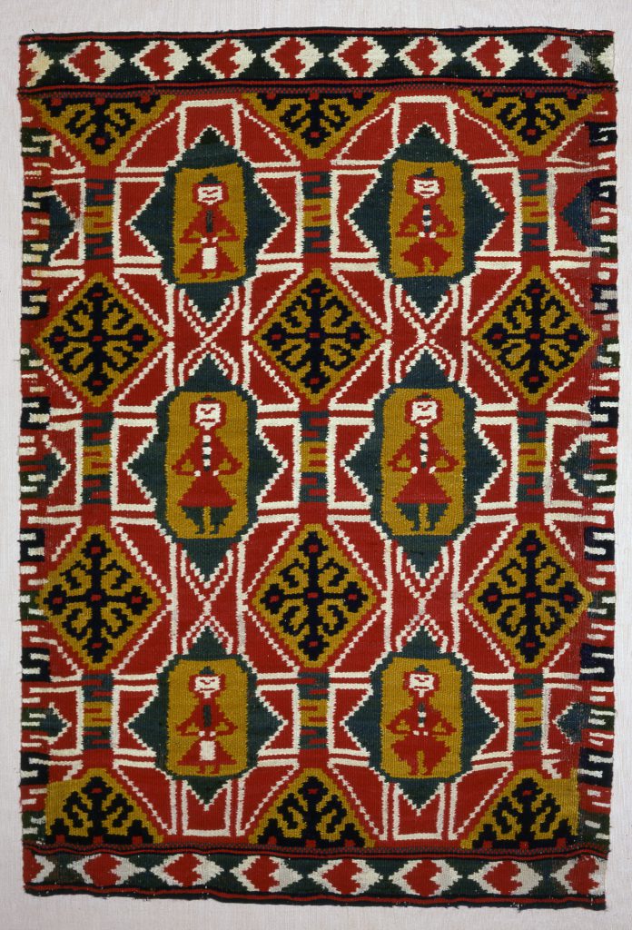 This very colourful carriage cushion cover is almost identical in both design and colour to the seat cushion cover SW 89. Here there are men and women in the upper and lower rows, but only men in the central row.