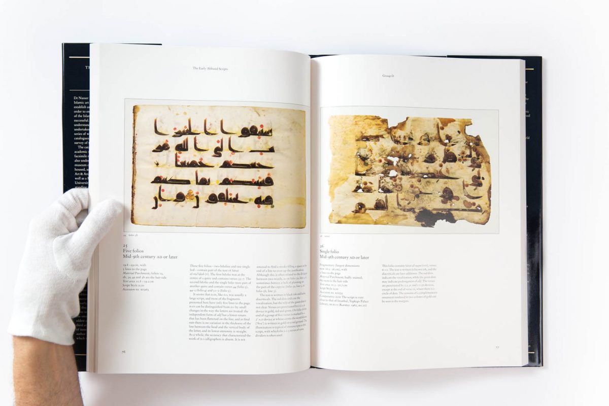 The catalogue contains 98 items, which are described and illustrated in colour. Included among these are a significant number of complete manuscripts, some with their original bindings; two folios from the famous 9th-century Qur’an written in gold on blue parchment; and two quires from a 10th‑century Qur’an, the only copy known to have been produced in Sicily.