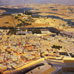 Reflecting Sir David’s dream for peace and harmony between the three great monotheistic faiths, in 1983 he initiated an ambitious project that took over 15 years to complete. Through a special commission, five large paintings by the artist Ben Johnson were created which together form a House of Peace between the three faiths. The first four include a panorama of Jerusalem, the biggest representation of the Holy City that exists in the world today; the Western Wall; the Christian Quarter and the Dome of the Rock. The fifth painting, conceived by Professor Khalili himself, depicts a Circle of Peace, a kaleidoscope of the word ‘peace’ in Hebrew, English and Arabic.